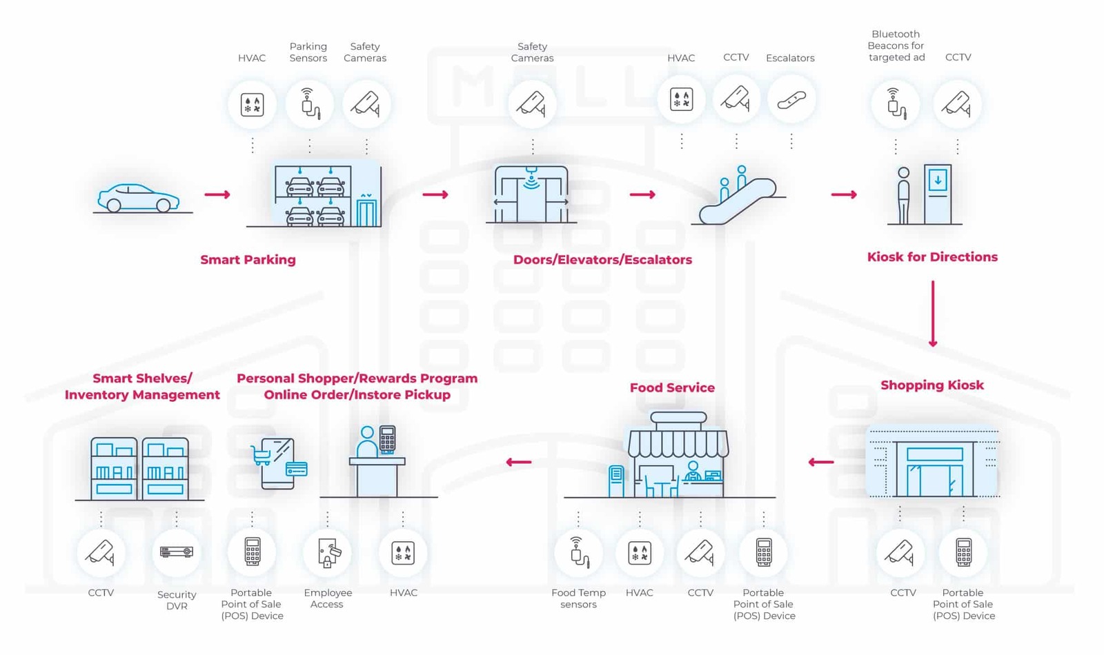 Visualisez vos systèmes de vidéosurveillance, de gestion de l'énergie, d'ascenseurs, de CVC, d'éclairage, de points de vente, d'étagères intelligentes, de stationnement intelligent, et plus encore depuis chaque emplacement.